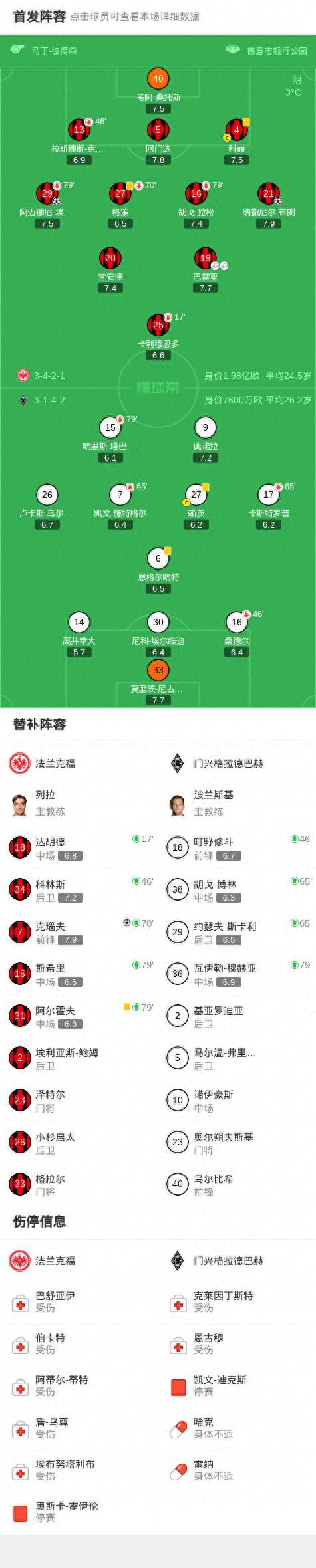 北京時間2月14日德國足球頂級聯賽 聯賽 第22輪,法蘭克福主場對陣門興格拉德巴赫。法蘭克福納撒尼爾-布朗破門,阿邁穆尼-埃奇古亞布破門,克瑙夫破門。最終比分法蘭克福 3-0 門興格拉德巴赫。