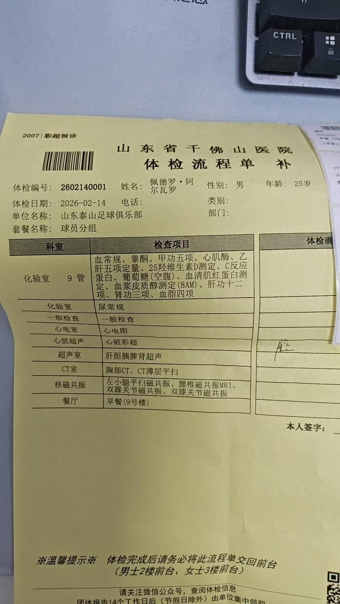 據網傳圖片顯示,山東泰山新援佩德羅-阿爾瓦羅已經在山東省千佛山醫院完成山東泰山的體檢。