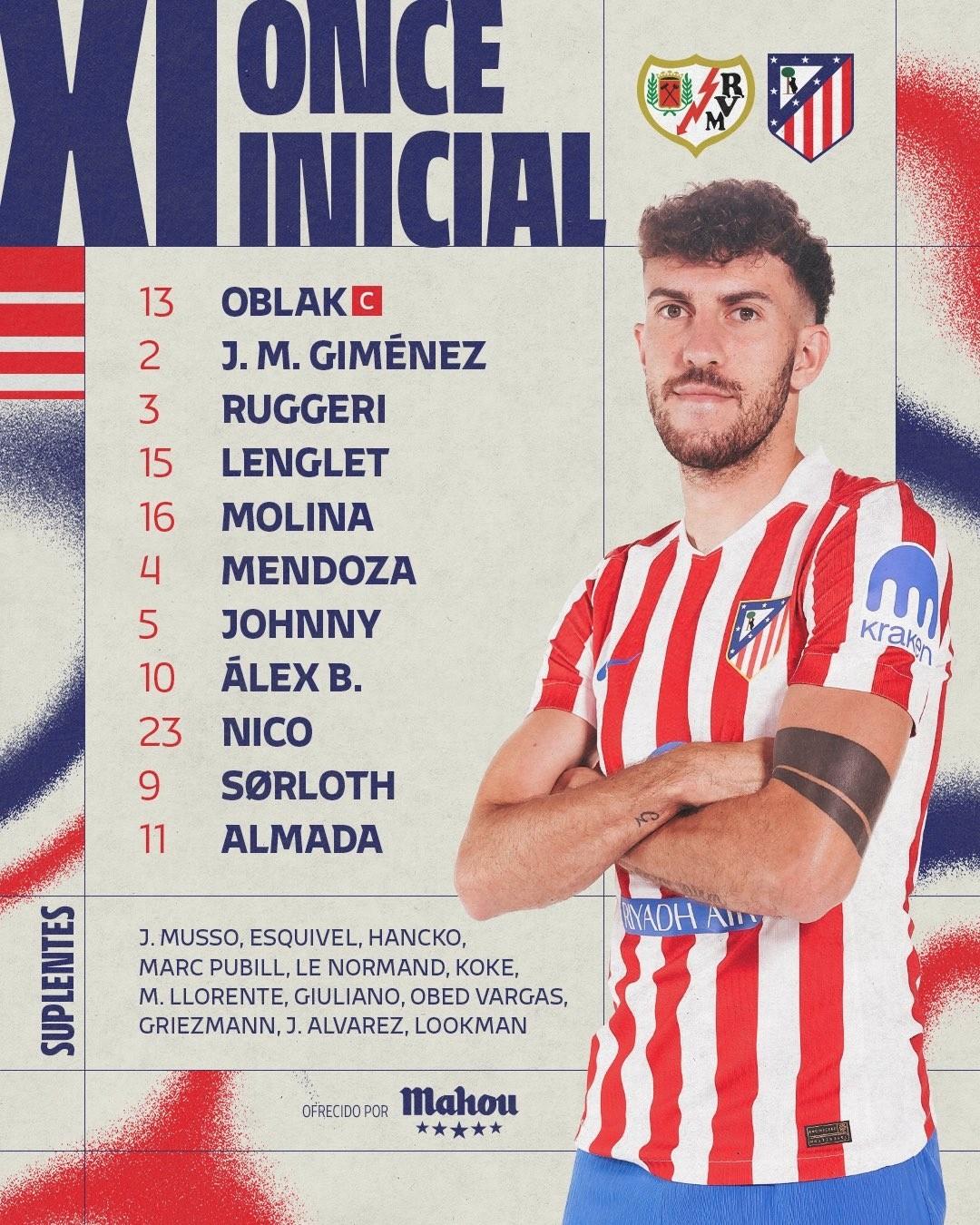 馬德里競技首發:13-奧布拉克、2-希門尼斯、3-魯傑裏、15-朗格萊、16-莫利納、4-門多薩、5-卡多佐、10-巴埃納、23-尼古拉斯-岡薩雷斯、9-瑟洛特、11-阿爾馬達