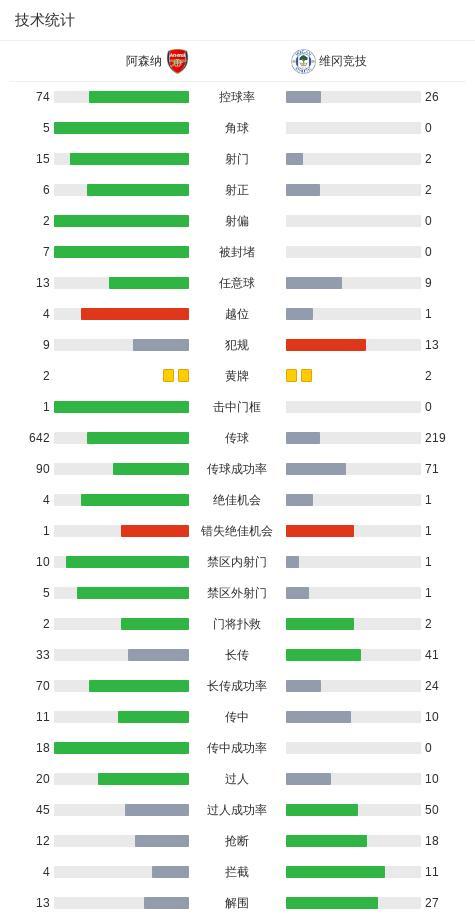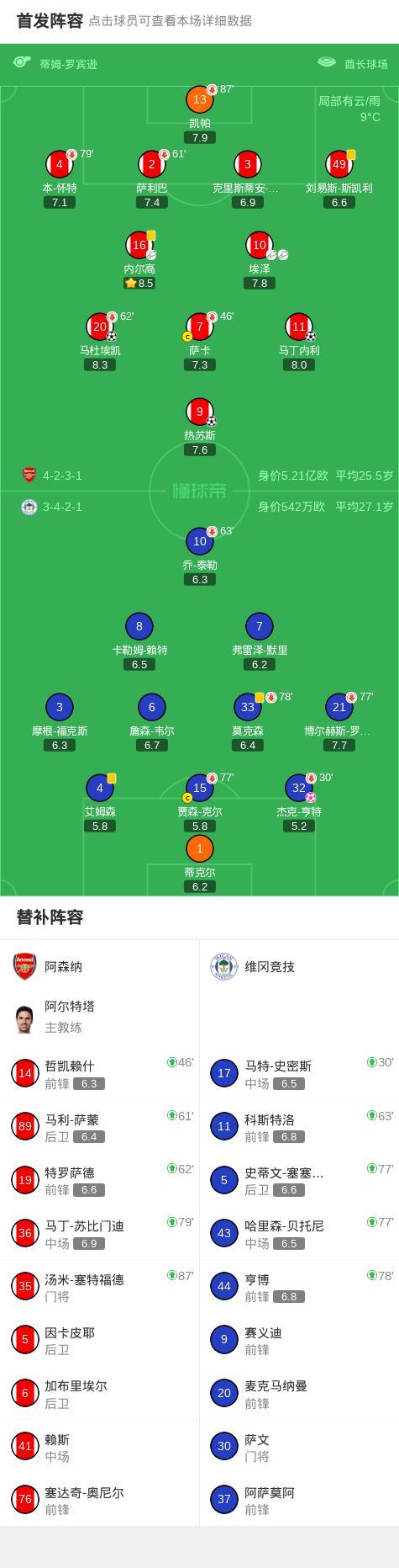 第19分鐘,埃澤直塞再送助攻,馬丁內利突入禁區破門,阿森納2-0維岡競技