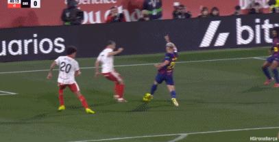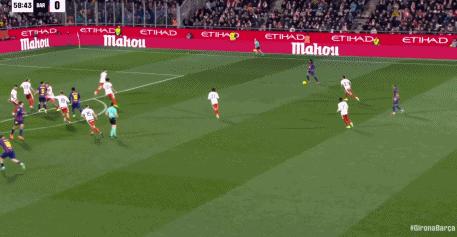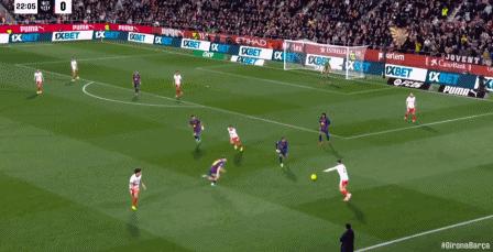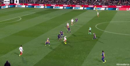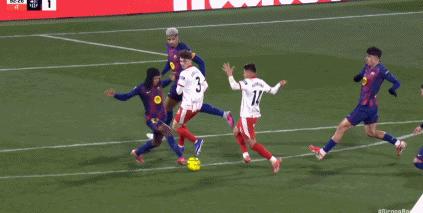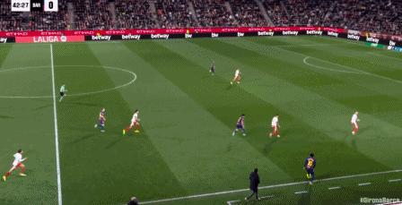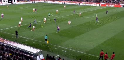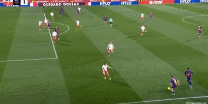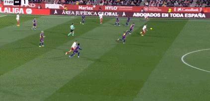 第34分鐘,拉菲尼亞直塞,費爾明小角度打門踢飛