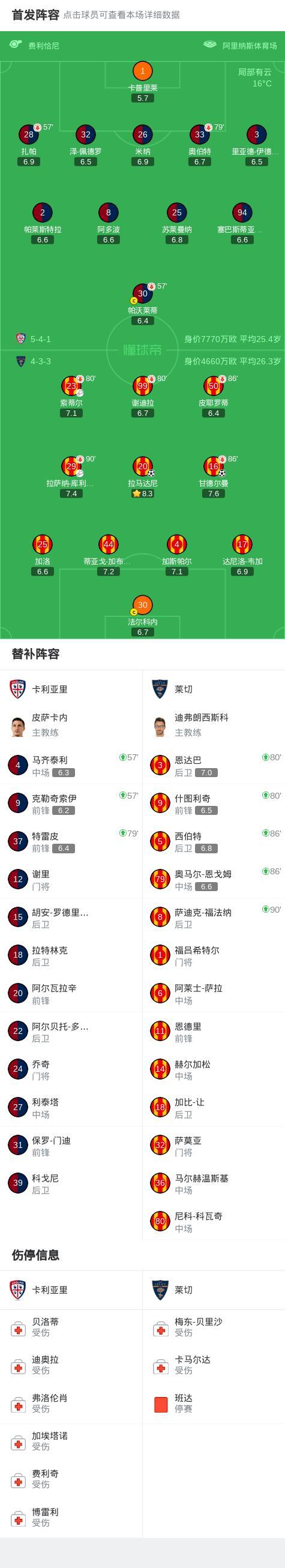 北京時間2月17日意大利足球頂級聯賽 聯賽 第25輪,卡利亞里主場對陣萊切。萊切甘德爾曼破門,拉馬達尼破門。最終比分卡利亞里 0-2 萊切。