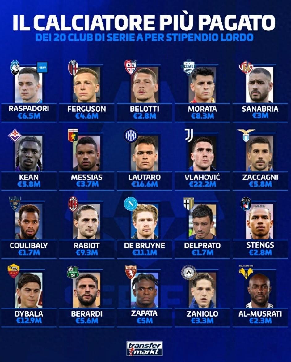 德轉列意甲各隊頂薪球員:弗拉霍維奇2220萬第1,勞塔羅1660萬