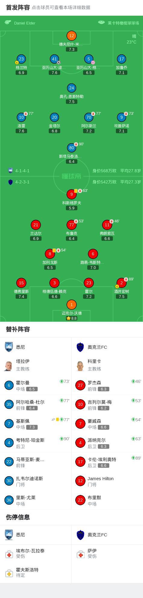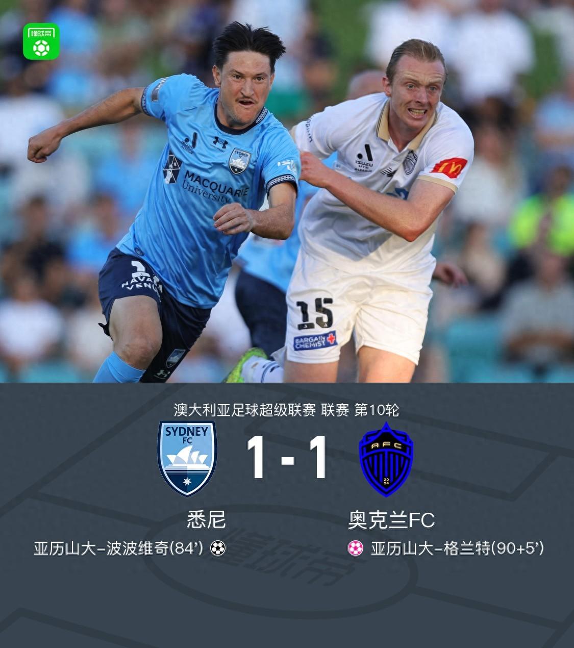 悉尼1-1奧克蘭FC,波波維奇破門,亞歷山大-格蘭特烏龍絕平