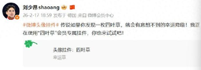 2月17日,中國短道速滑選手劉少昂將微博頭像掛件換成了四葉草。