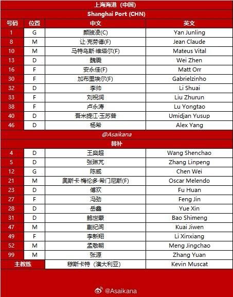 替補:12-陳威、4-王燊超、5-張琳芃、21-梅倫多、23-傅歡、27-馮勁、28-嶽鑫、31-鮑世蒙、47-蒯紀聞、49-李新翔、52-孟敬朝、99-張源