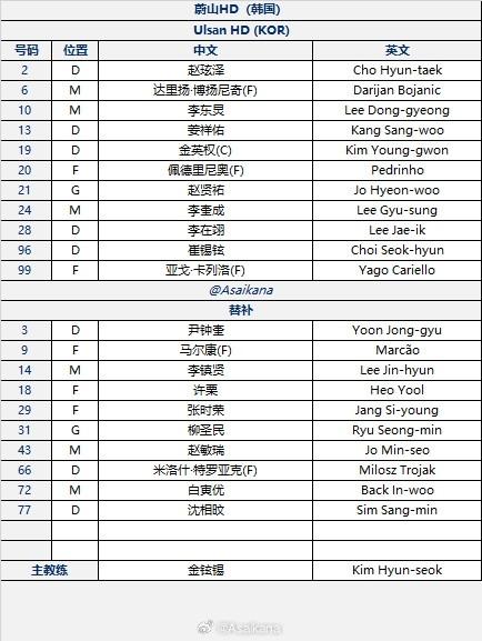 蔚山首發:21-趙賢祐、2-趙玹澤、19-金英權、28-李在翊、13-姜祥佑、96-崔錫鉉、6-博揚尼奇、10-李東炅、24-李奎成、20-佩德里尼奧、99-亞戈-卡列洛