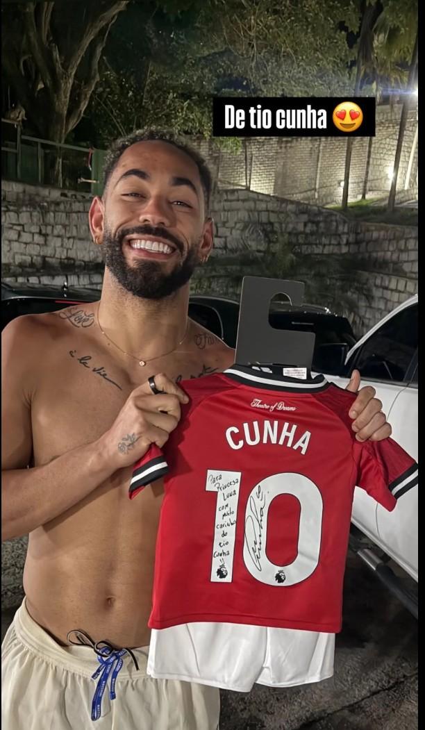 這位巴西人曬出了赤裸上身、手持曼聯復刻球衣的照片。