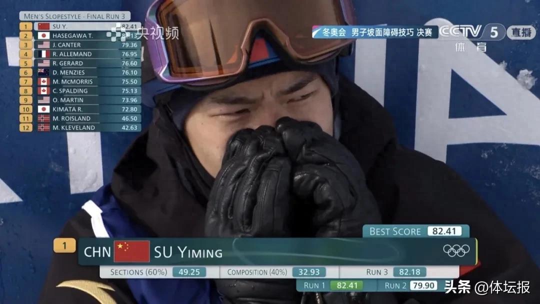 2月15日,米蘭冬奧會單板滑雪男子坡面障礙技巧預賽中,蘇翊鳴以兩輪的最好成績72.78分位列第8名晉級。今晚決賽進行三輪比拼,共有12位選手參賽,蘇翊鳴三輪成績分別爲:82.41分、79.90分、82.18分,最終以三輪的最好成績82.41分取得金牌,日本選手長谷川帝勝以82.13分取得銀牌,美國選手坎特以79.36分取得銅牌。