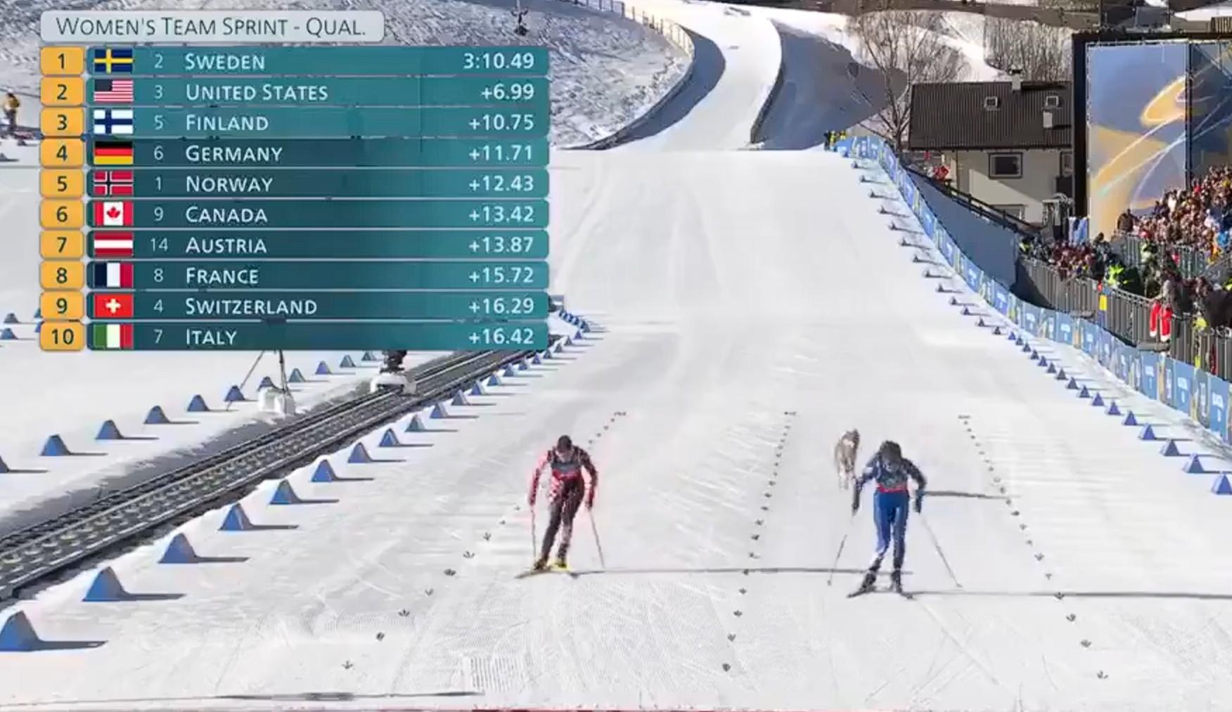 2月19日,據外媒報道,一隻當地小狗闖入正在進行比賽的越野滑雪賽道終點直道。