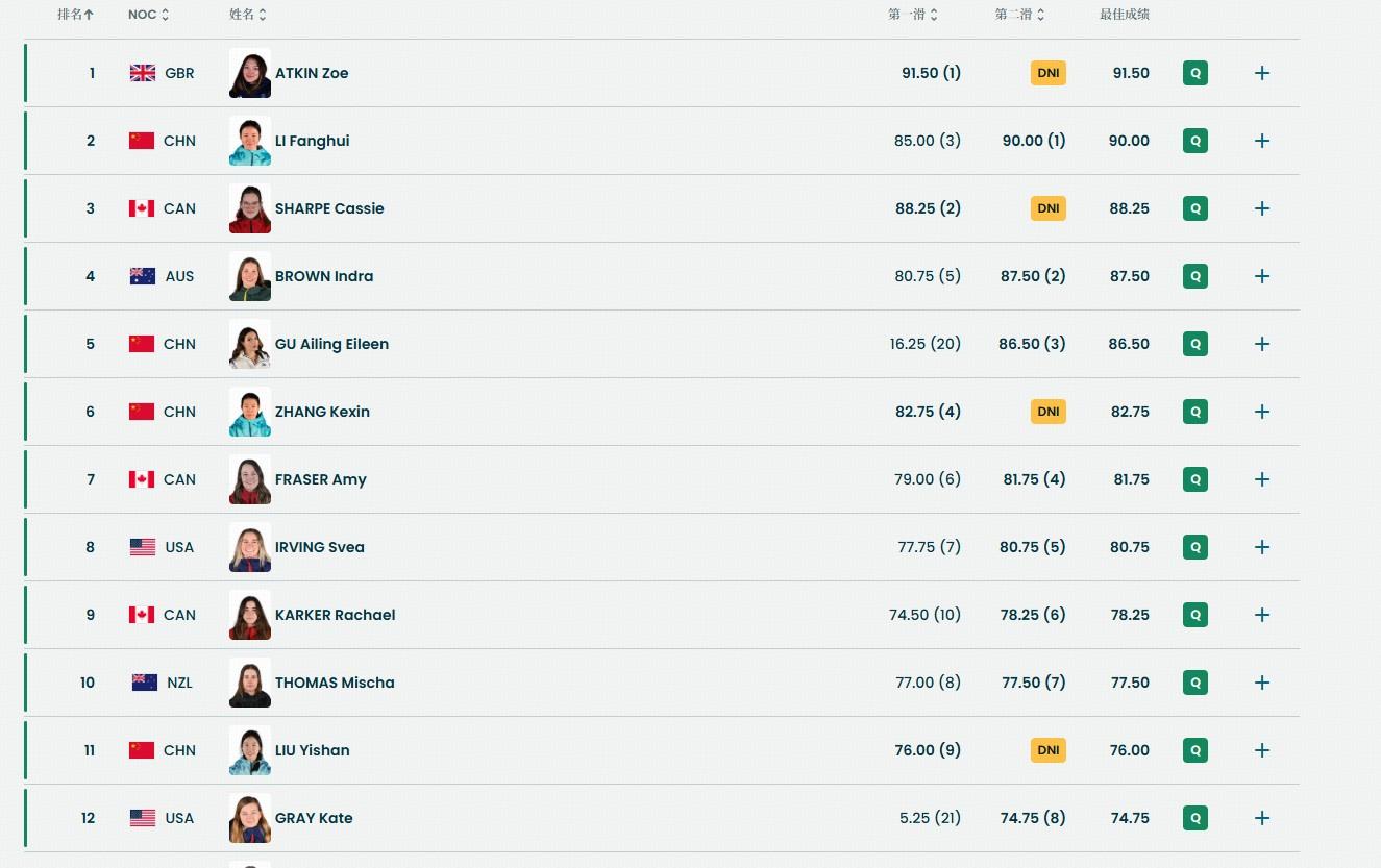 最終,谷愛凌、李方慧、劉奕杉和張可欣4人都成功晉級到2月22日的決賽。
