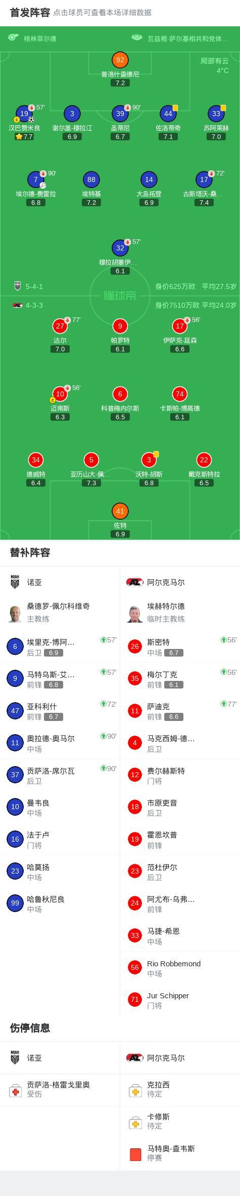 北京時間2月20日歐洲協會聯賽 淘汰賽附加賽首回合,諾亞對陣阿爾克馬爾。諾亞漢巴贊米良破門。最終比分諾亞 1-0 阿爾克馬爾。精彩瞬間第53分鐘,諾亞球員埃爾德-費雷拉助攻漢巴贊米良打入一球。球隊陣容 技術統計