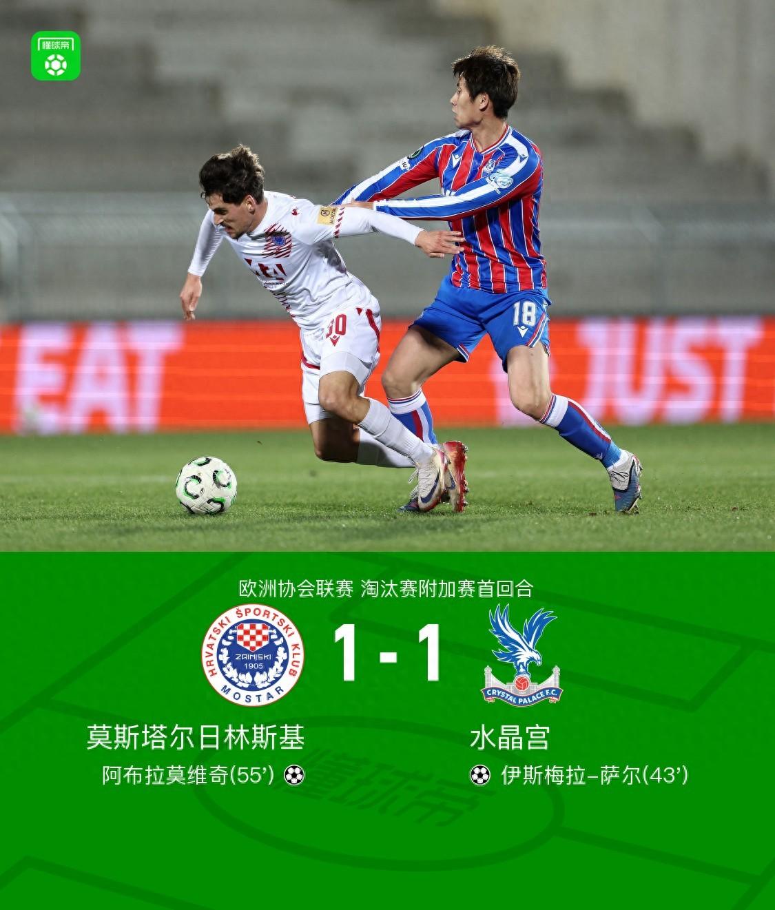 北京時間2月20日歐洲協會聯賽 淘汰賽附加賽首回合,莫斯塔爾日林斯基對陣水晶宮。上半場,拉森做球,薩爾低射破門。下半場,米基奇助攻,阿布拉莫維奇扳平比分。全場比賽結束,水晶宮1-1戰平莫斯塔爾日林斯基。