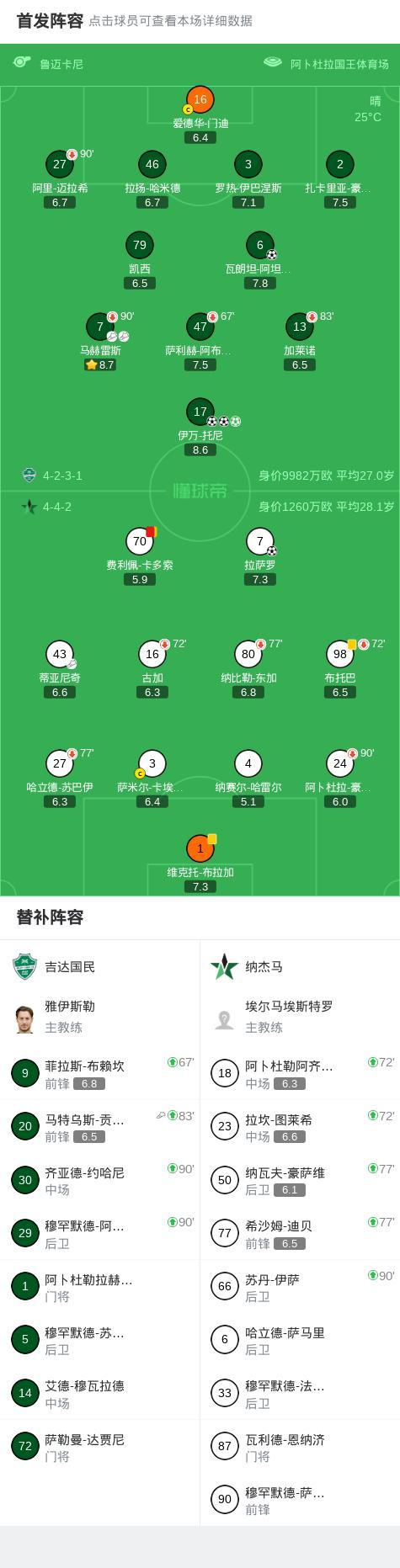 第69分鐘,吉達國民球員馬赫雷斯助攻伊萬-託尼打入一球。