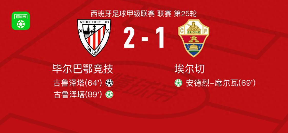 北京時間2月21日西班牙足球甲級聯賽 聯賽 第25輪,畢爾巴鄂競技主場對陣埃爾切。畢爾巴鄂競技古魯澤塔梅開二度。埃爾切安德烈-席爾瓦破門。最終比分畢爾巴鄂競技 2-1 埃爾切。