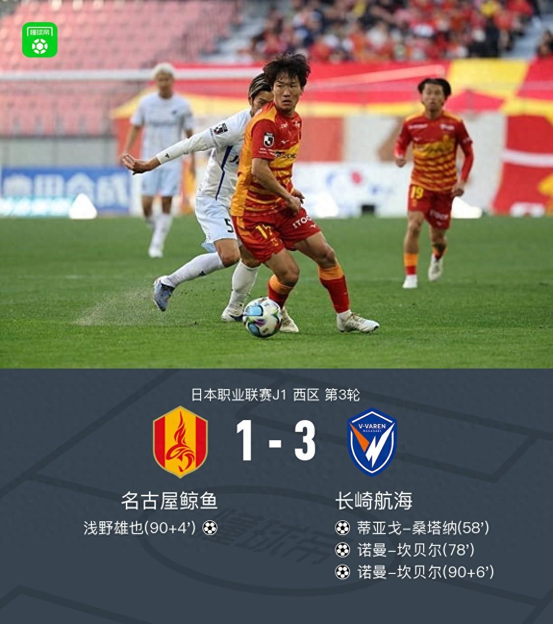 北京時間2月21日,日本職業聯賽J1西區第3輪,名古屋鯨魚主場對陣長崎航海。比賽中,蒂亞戈-桑塔納、諾曼-坎貝爾接連破門助長崎航海2-0領先;補時階段,淺野雄也爲名古屋鯨魚扳回一城,諾曼-坎貝爾再下一城鎖定勝局。最終,名古屋鯨魚1-3不敵長崎航海。