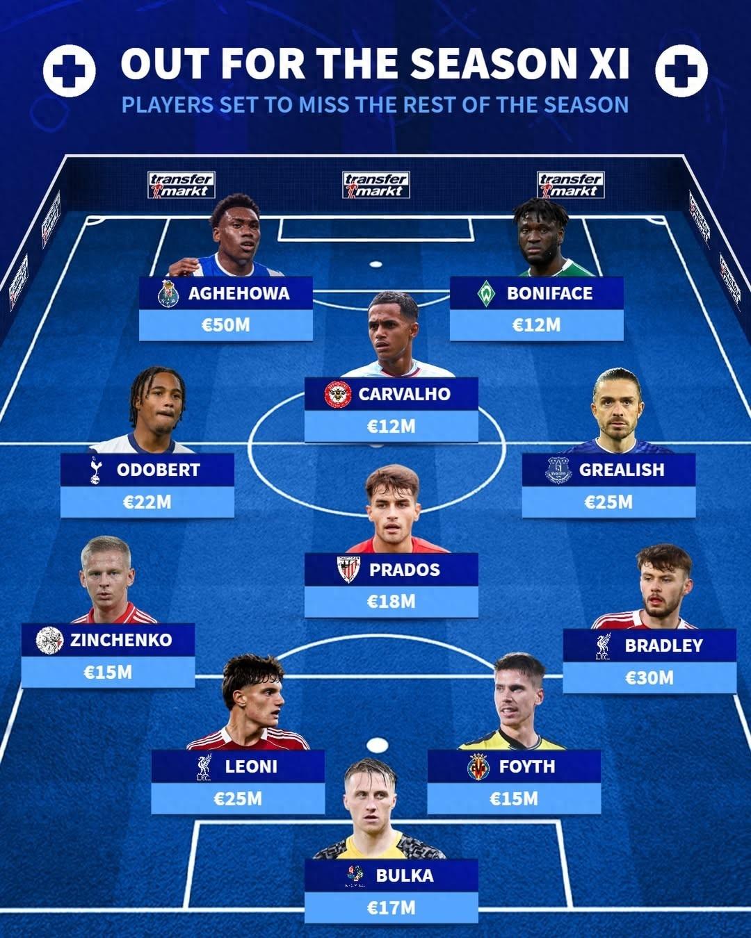 本賽季報銷陣容:格拉利什、萊昂尼、布拉德利、奧多貝爾在列