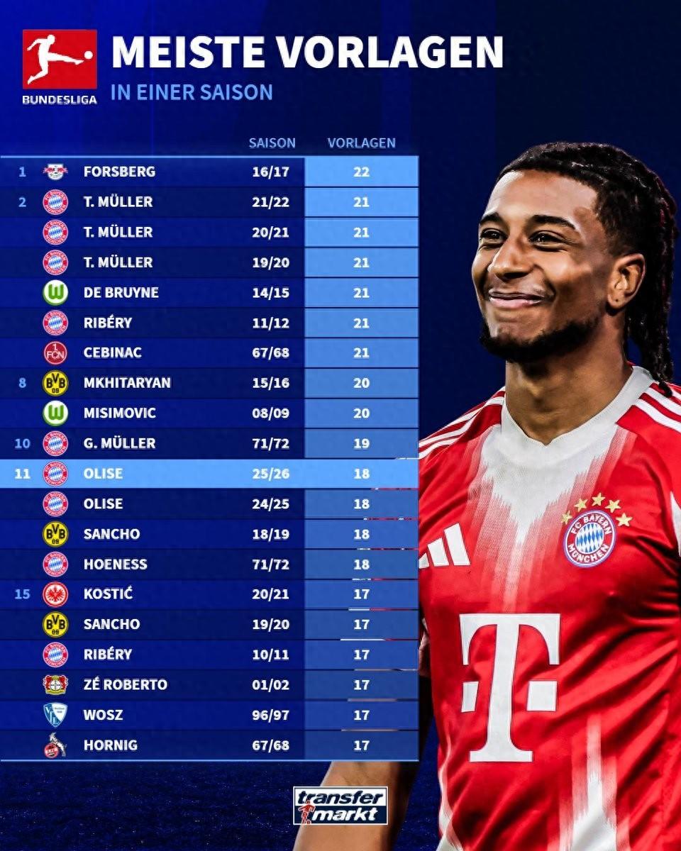 按照德轉的統計,奧利塞本賽季德甲出場21次送出18次助攻,這一數據已經能夠排在德甲歷史單賽季助攻榜的並列第11位,目前這位法國球星距離福斯貝里保持的德甲單賽季22次助攻的紀錄還差4次,在本賽季德甲還剩餘12輪比賽的情況下,奧利塞很有希望打破這一紀錄。