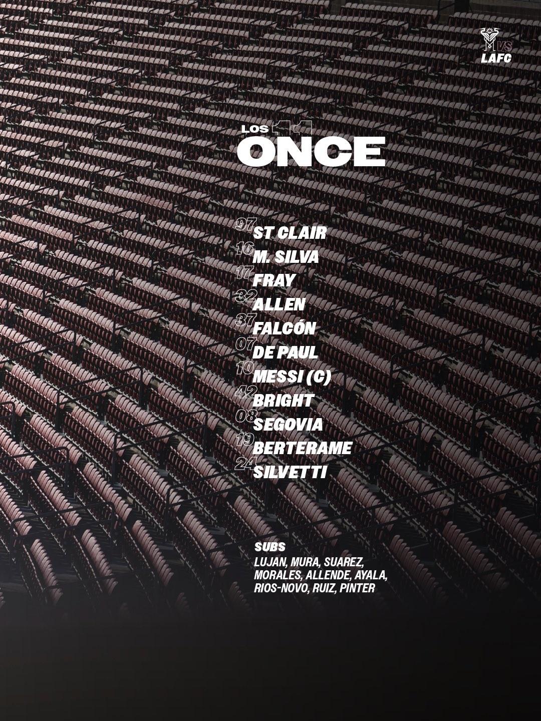 邁阿密國際首發:97-聖克萊爾、32-艾倫、16-米卡埃爾、37-法爾孔、17-弗雷、42-布賴特、7-德保羅、8-塞戈維亞、10-梅西、24-西爾維蒂、19-貝爾泰拉梅