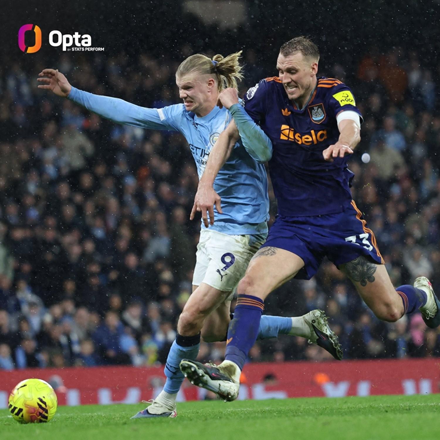 哈蘭德對陣紐卡贏下12次對抗,爲個人在五大聯賽單場最高數據