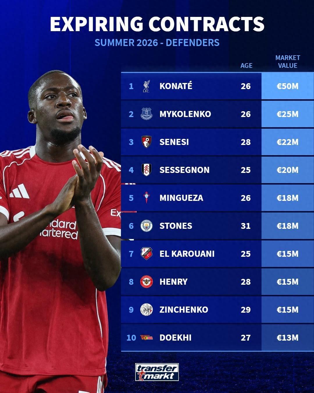德國轉會市場統計了今夏合同到期的十大後衛,其中球員按照身價從高到低排序。