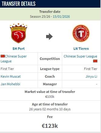 德轉:李浩然從上海海港加盟遼寧鐵人的轉會費約100萬人民幣