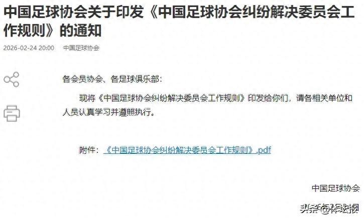 2月24日,中國足球協會印發《中國足球協會糾紛解決委員會工作規則》。