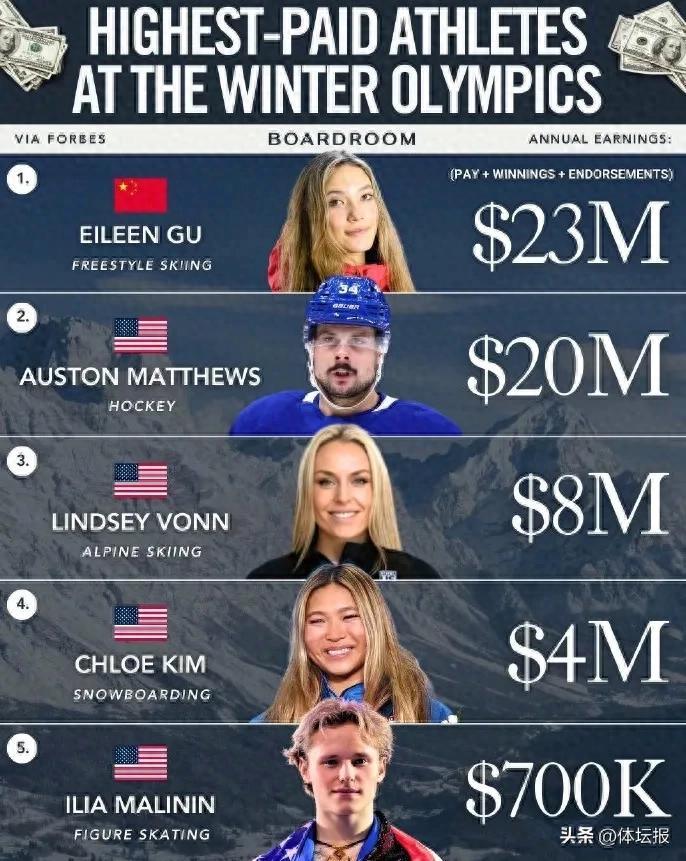 近日,商業媒體福布斯發佈了本屆冬奧會運動員收入排行榜前五名,谷愛凌以2300萬美元的收入排名第一。