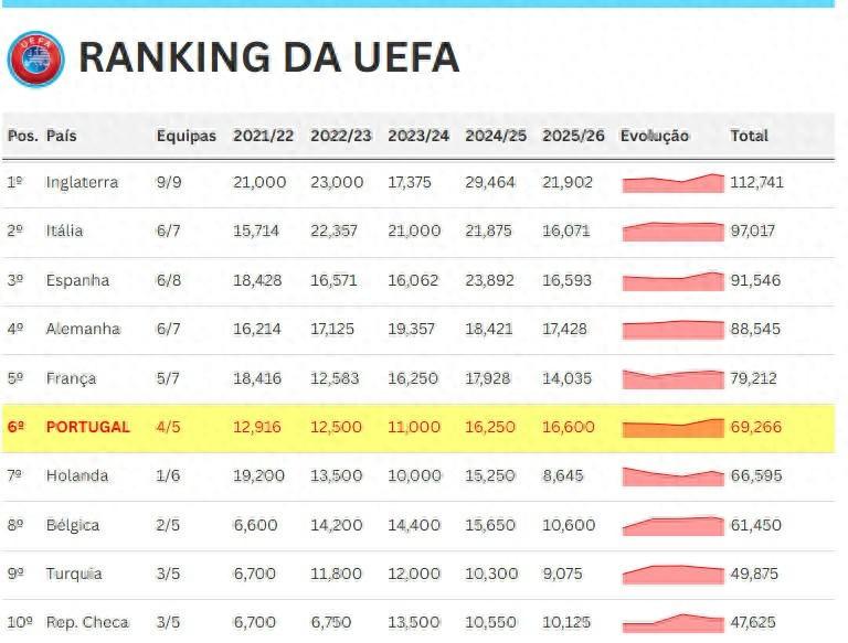 實際上,要想阻止葡萄牙排名第六,阿爾克馬爾必須贏得所有比賽並奪冠,同時希望葡萄牙的四支球隊不再贏得任何比賽,在這種情況下,他們將以69.595分領先於目前葡萄牙的69.266分。