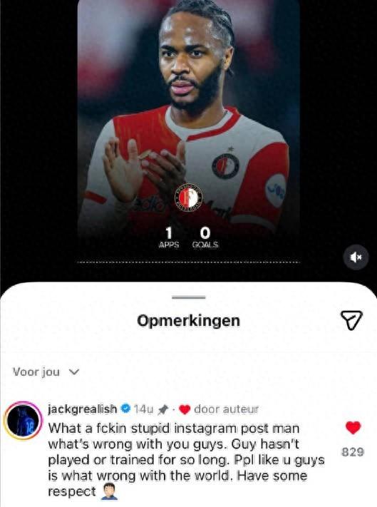 賽後,有球迷博主在社交媒體上批評斯特林表現差,接着,格拉利什在這條動態下進行了評論:“這他*是什麼傻*帖子?你們到底怎麼回事?他已經很長時間沒踢球、沒訓練了,像你們這樣的人,纔是這個世界的問題所在,請給點尊重吧。”