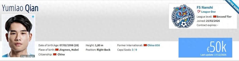 北京時間2月25日,德轉更新,天津津門虎後衛錢宇淼自由轉會佛山南獅。