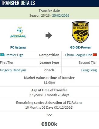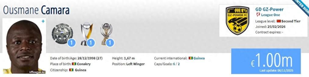 北京時間2月25日,德轉更新,阿斯塔納邊鋒奧斯曼-卡馬拉加盟廣東廣州豹,轉會費80萬歐。