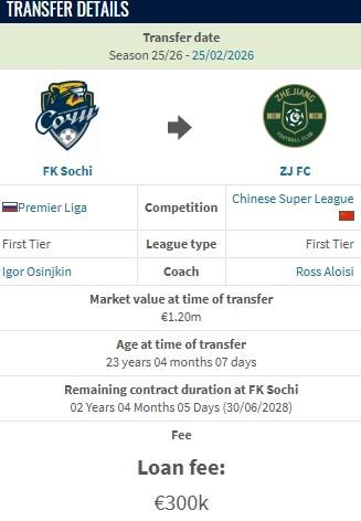德轉顯示,浙江隊新援瓜里拉帕的租借費爲30萬歐。