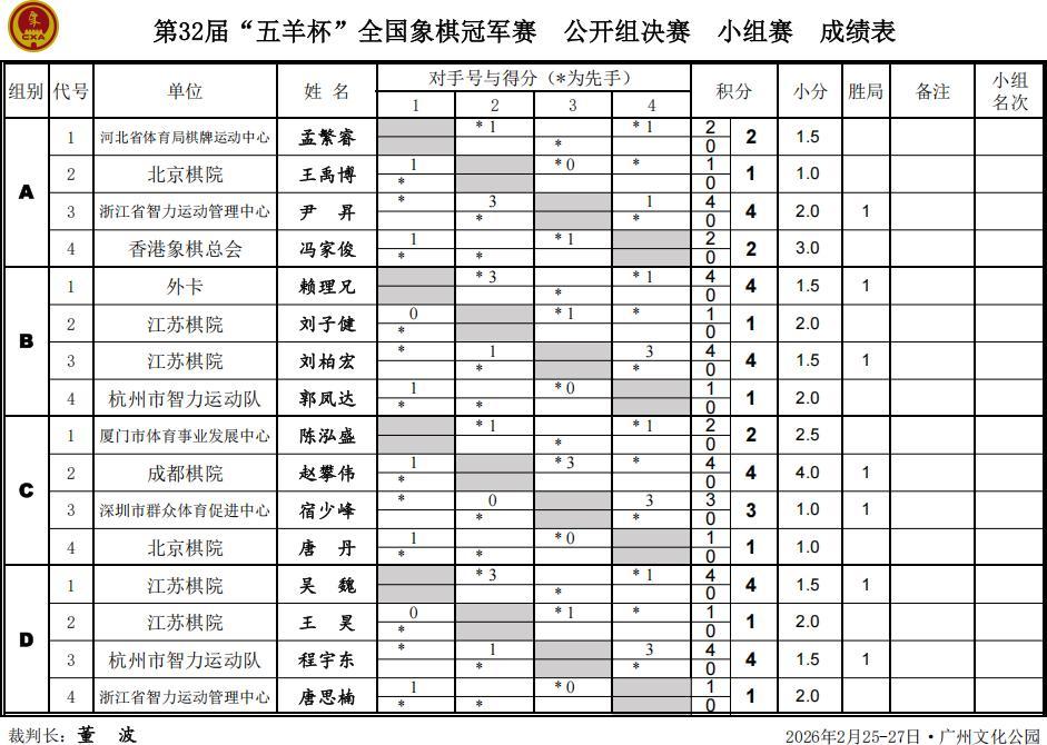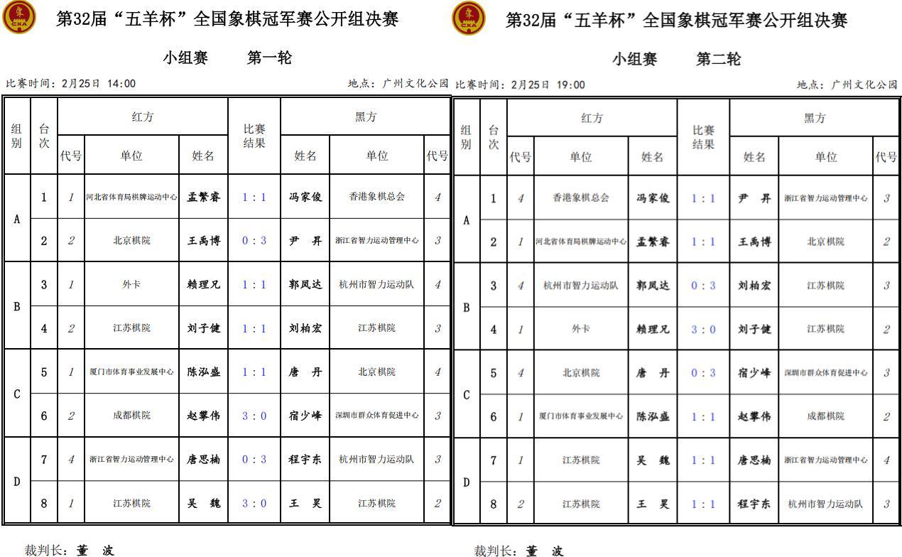 A組兩戰後,尹昇1勝1平積4分,孟繁睿、馮家俊均是二和,各2分,王禹博1和1負積1分。
