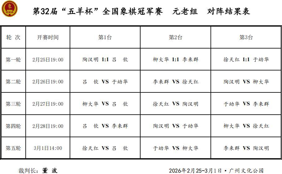 大賽26日下午兩點、晚上七點,進行本次五羊杯公開組第3、4輪,元老組第二輪的連場大斗,搶分強力大火拼,110萬鉅獎的出線之爭,到了關鍵時刻,誰能一舉勝出,力取晉級制高權,象棋王子也將繼續進行全程的直播和報道(抖音:象棋王子),敬請關注、支持、守護,謝謝!