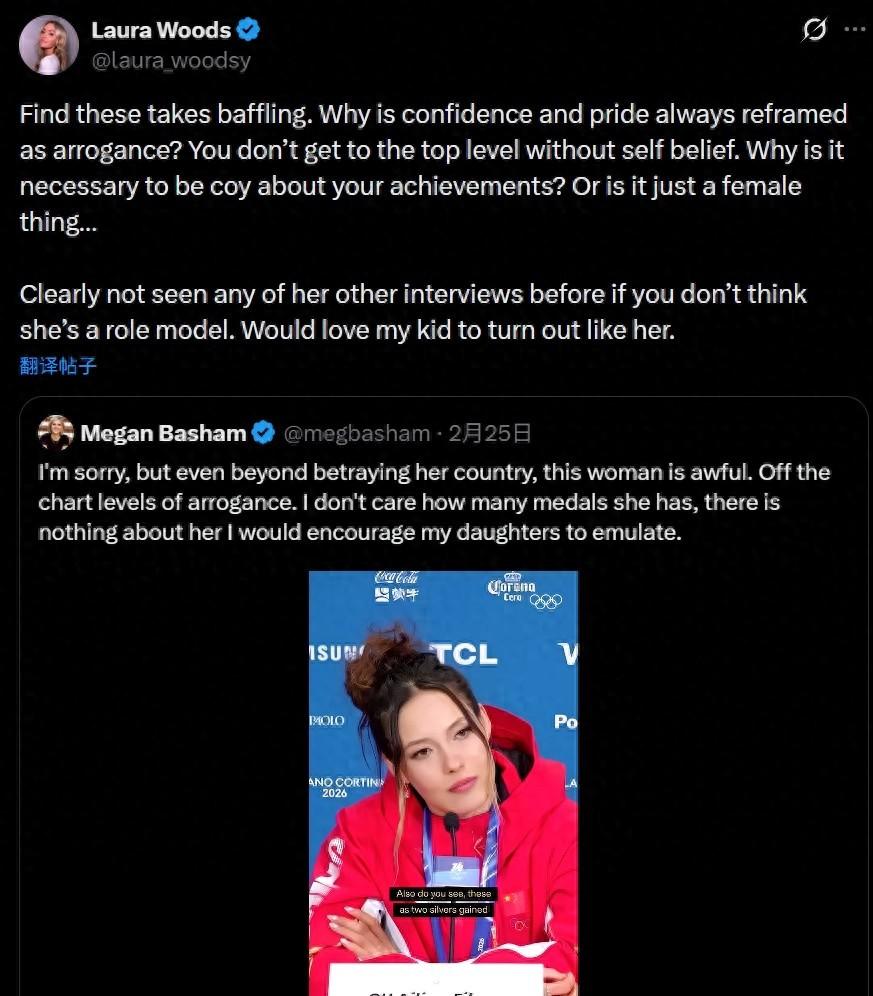 美國記者Megan Basham在社媒轉發了谷愛凌接受採訪的視頻並配文:抱歉,但即便拋開背叛不談,這個女人也很糟糕。她傲慢得令人難以置信,不管她拿過多少獎牌,我都不會鼓勵我的女兒向她學習。