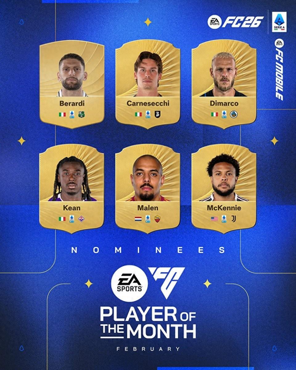 北京時間2月26日,意甲官方公佈了2月聯賽最佳球員的6位候選者,國際米蘭的左後衛迪馬爾科、羅馬前鋒馬倫以及尤文圖斯中場麥肯尼在列。
