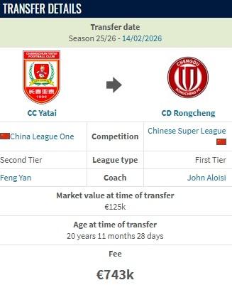 德轉顯示,賀一然從長春亞泰加盟成都蓉城的轉會費約600萬人民幣。