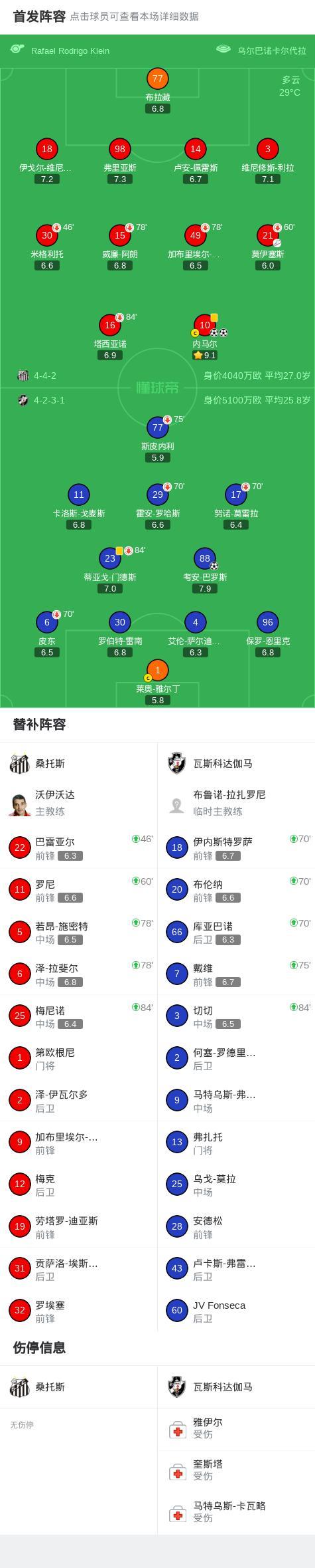 北京時間2月27日巴西足球甲級聯賽 聯賽 第4輪,桑托斯主場對陣瓦斯科達伽馬。桑托斯內馬爾梅開二度。瓦斯科達伽馬考安-巴羅斯破門。最終比分桑托斯 2-1 瓦斯科達伽馬。