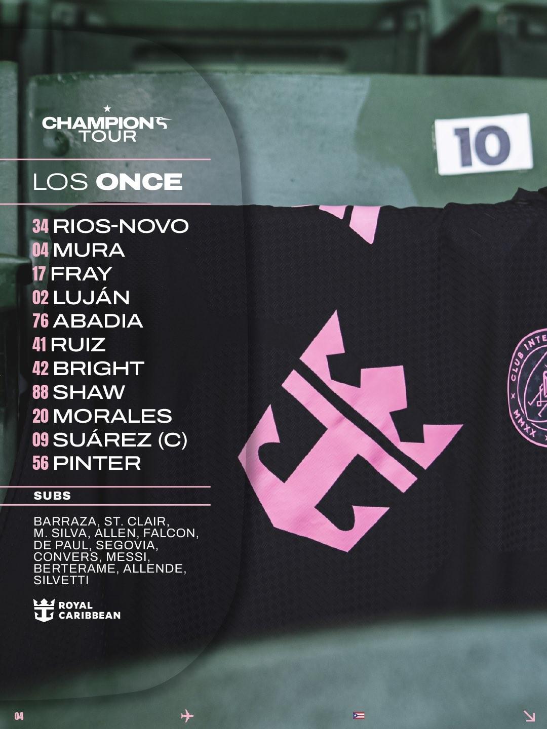 邁阿密國際首發:34-里奧斯、4-穆拉、14-弗雷、2-盧漢、76-阿巴迪亞、41-魯伊斯、42-布賴特、88-肖、20-莫拉萊斯、9-蘇亞雷斯、56-平泰爾