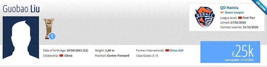 北京時間2月27日,德轉更新,山東泰山前鋒劉國寶租借加盟青島海牛,租借費約40萬人民幣。