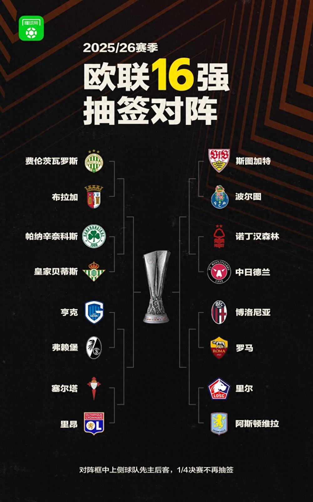 北京時間2月27日,2025/26賽季歐聯淘汰賽抽籤儀式在瑞士尼翁的歐足聯總部進行,在16強中,維拉將迎戰里爾,羅馬與博洛尼亞進行同國內戰。