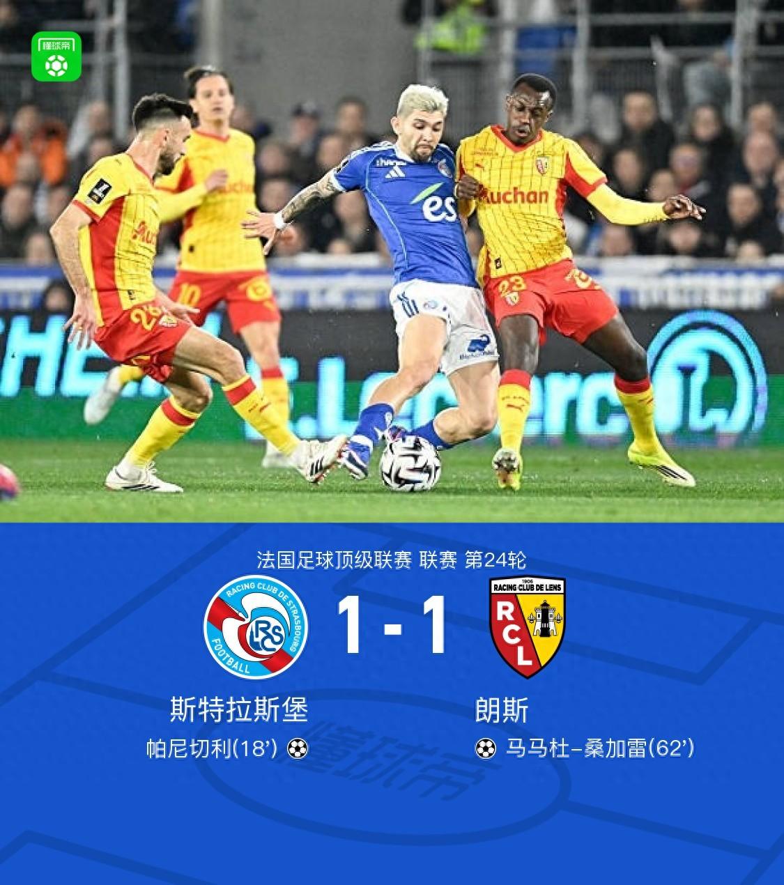 北京時間2月28日法國足球甲級聯賽第24輪,斯特拉斯堡主場迎戰朗斯。上半場,加尼烏回傳送禮,帕尼切利挑射破門。下半場,桑加雷扳平比分。全場比賽結束,斯特拉斯堡1-1戰平朗斯。