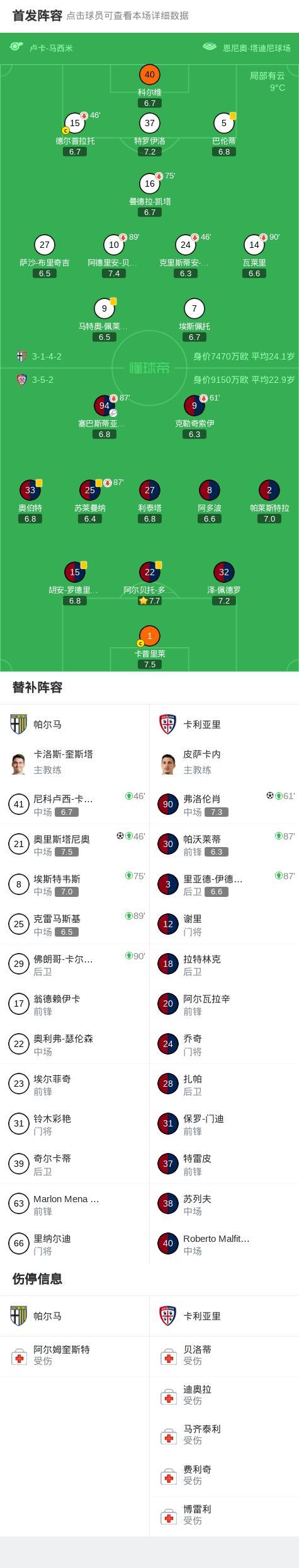 帕爾馬1-1卡利亞里,弗洛倫肖破門,奧里斯塔尼奧扳平