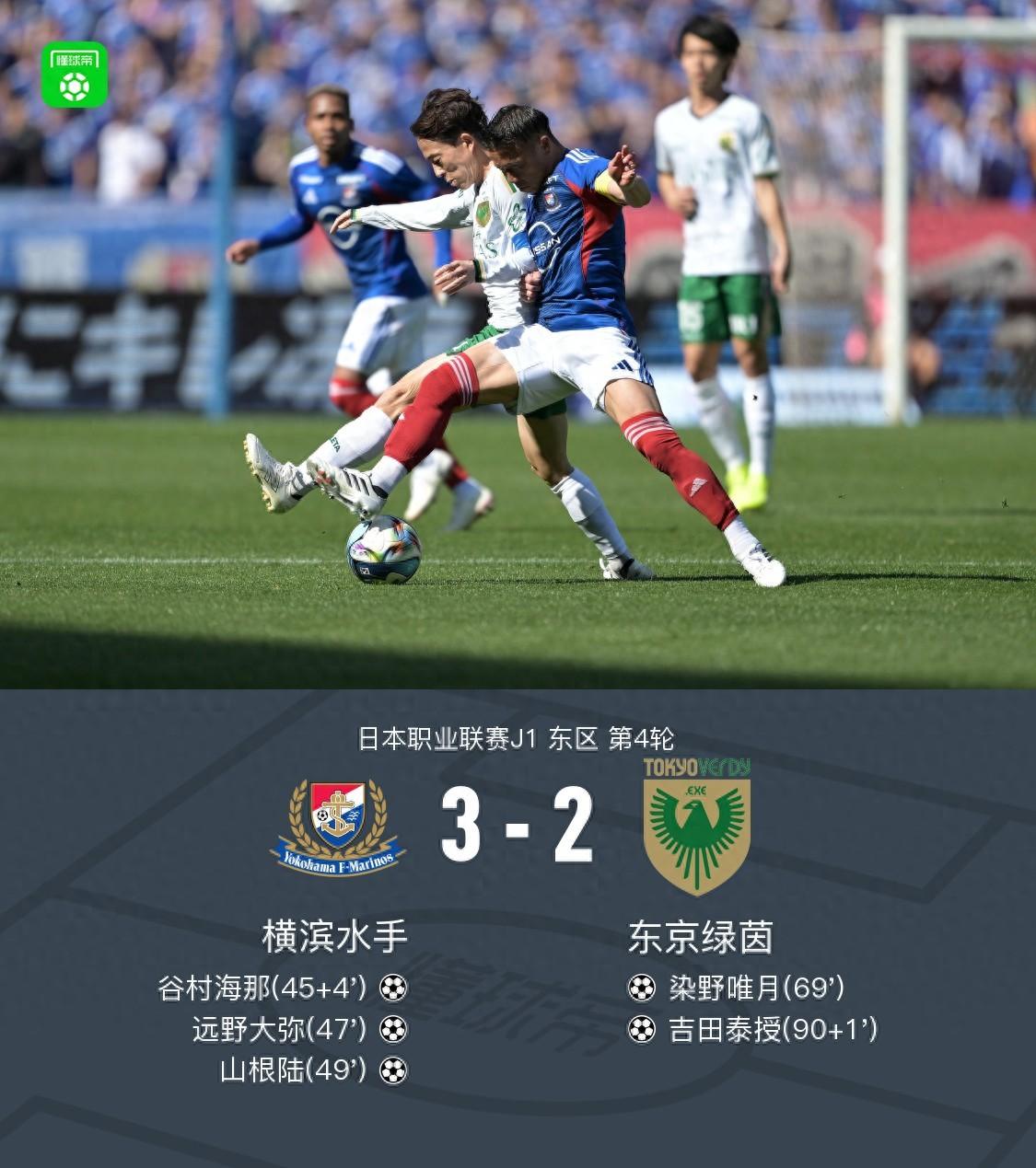 北京時間2月28日日本職業聯賽J1 東區 第4輪,橫濱水手主場對陣東京綠茵。橫濱水手谷村海那破門,遠野大彌破門,山根陸破門。東京綠茵染野唯月破門,吉田泰授破門。最終比分橫濱水手 3-2 東京綠茵。