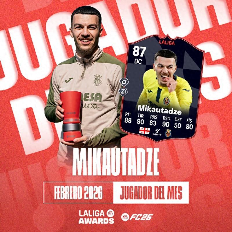 北京時間2月28日,官方消息,比利亞雷亞爾前鋒米卡塔澤當選西甲2月最佳球員。