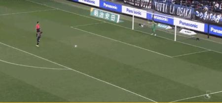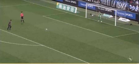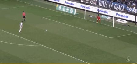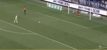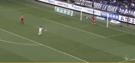 第27分鐘,食野亮太郎門前補射破門,大阪鋼巴1-0清水心跳