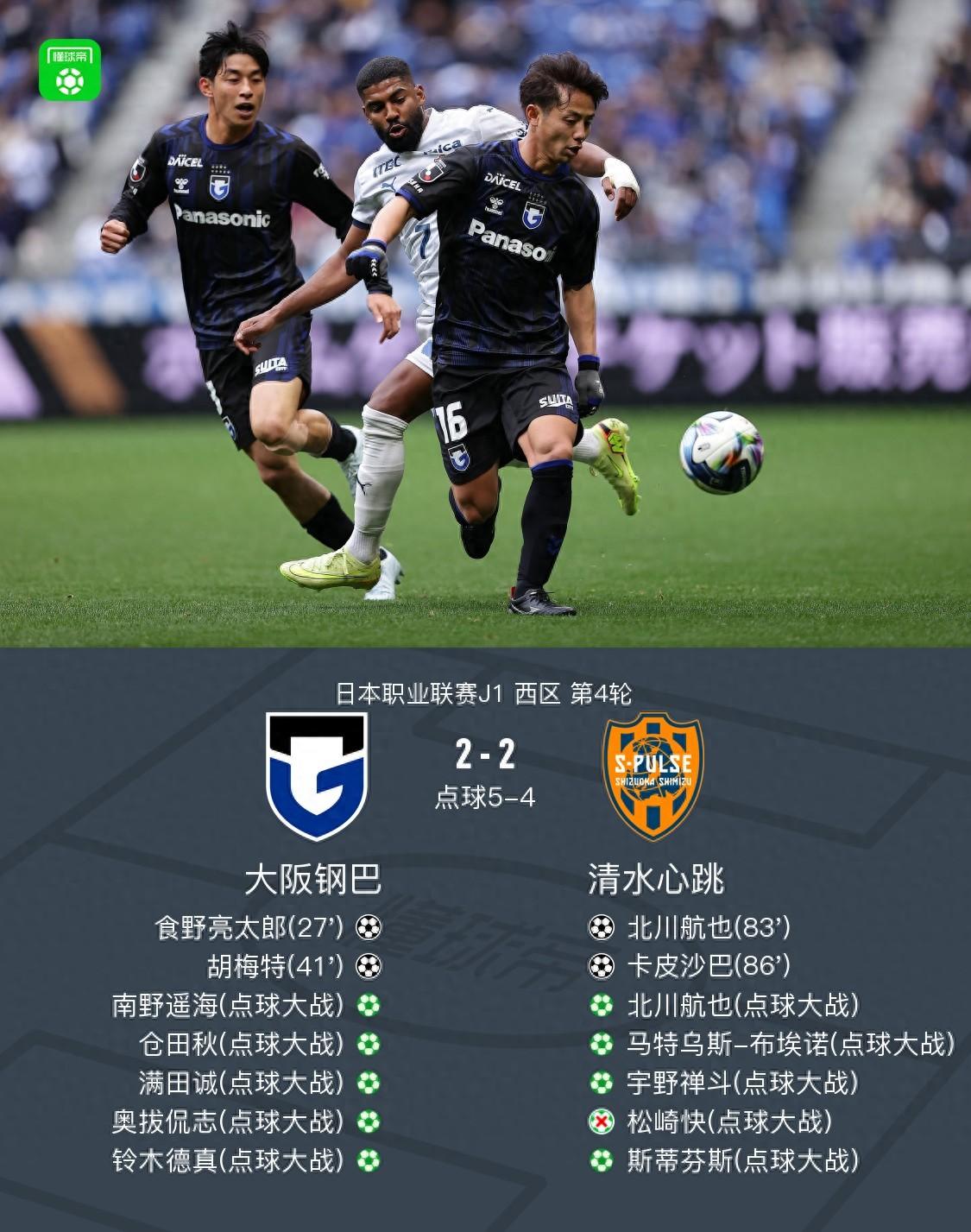 點球大戰大阪鋼巴7-6戰勝清水心跳晉級下一輪,卡皮沙巴傳射