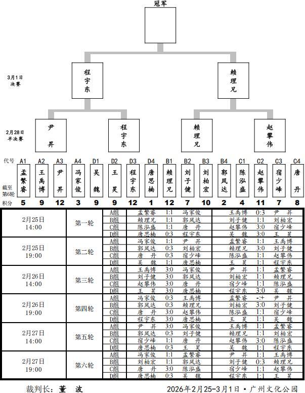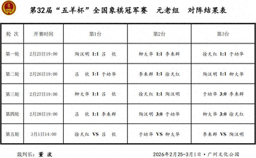 賽會3月1日上午九點半、下午兩點,展開本次大賽冠亞軍總決賽賴理兄與程宇東的分先兩局終極大決戰,尹昇趙攀偉季軍賽,以及元老組第五輪決勝戰,誰能一舉勝出,豪取雄冠,力攬三十萬大獎,笑傲王中王金座,象棋王子抖音號持續直播。