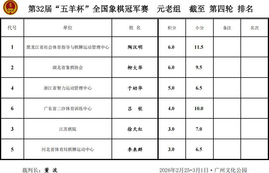 元老組四戰後,陶漢明、柳大華6分,於幼華5分,呂欽4分,徐天紅、李來羣3分。